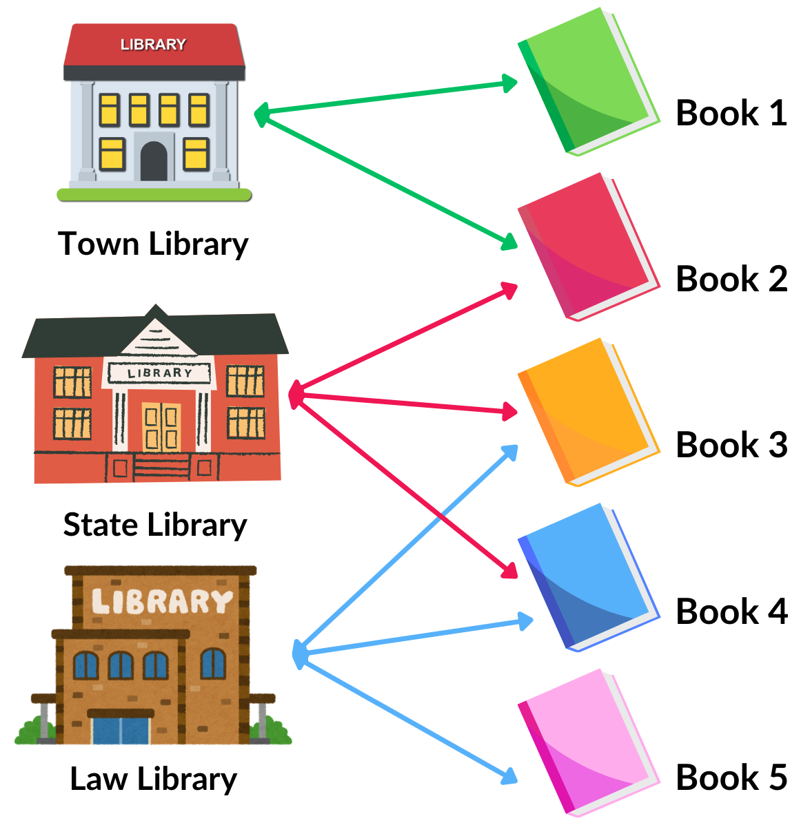 Each Library (Town, State, and Law) is represented as boxes to the left, with all books on the right.