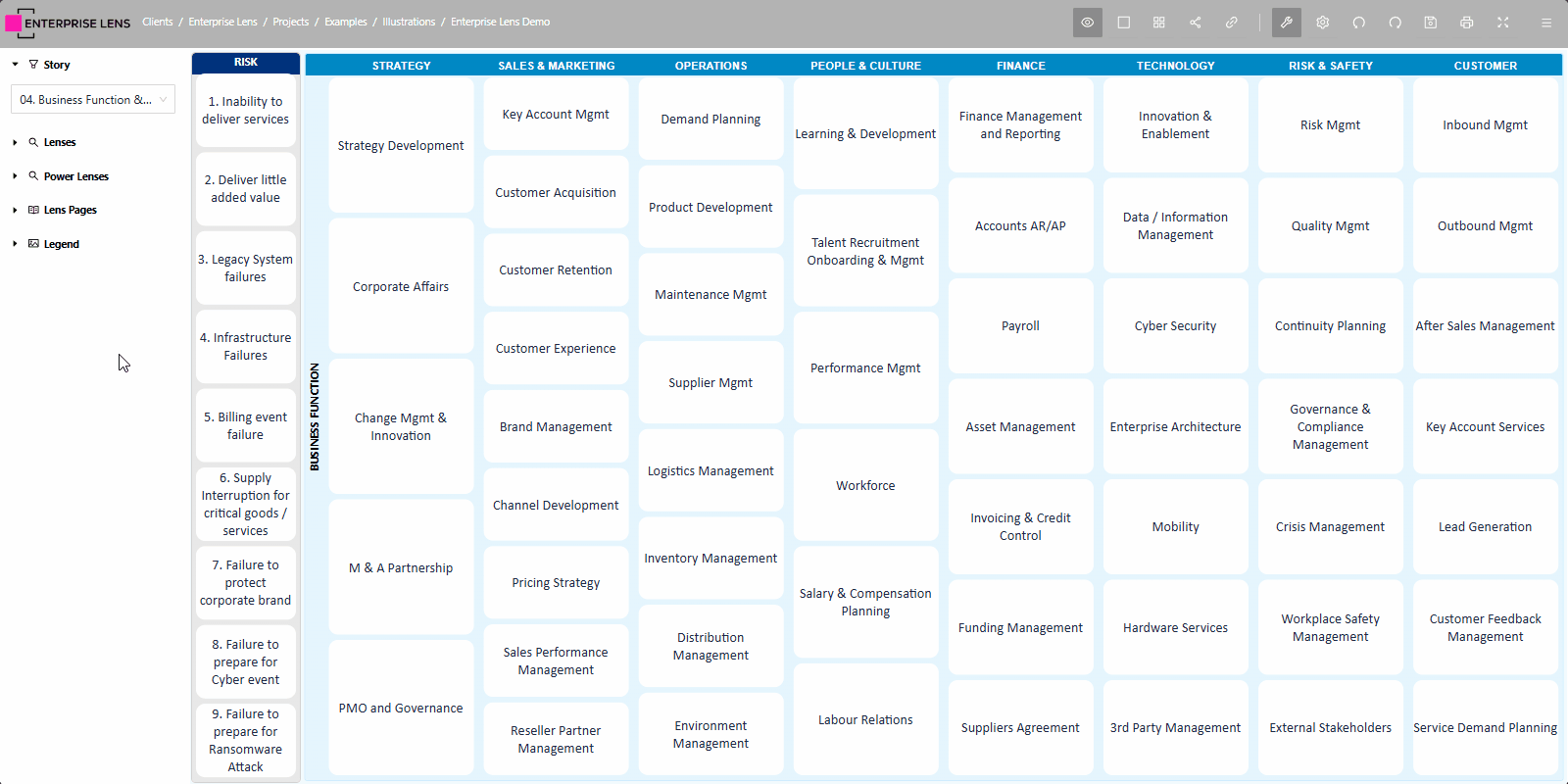 Both Business Functions and Risks are represented as individually labelled boxes, allowing you to: