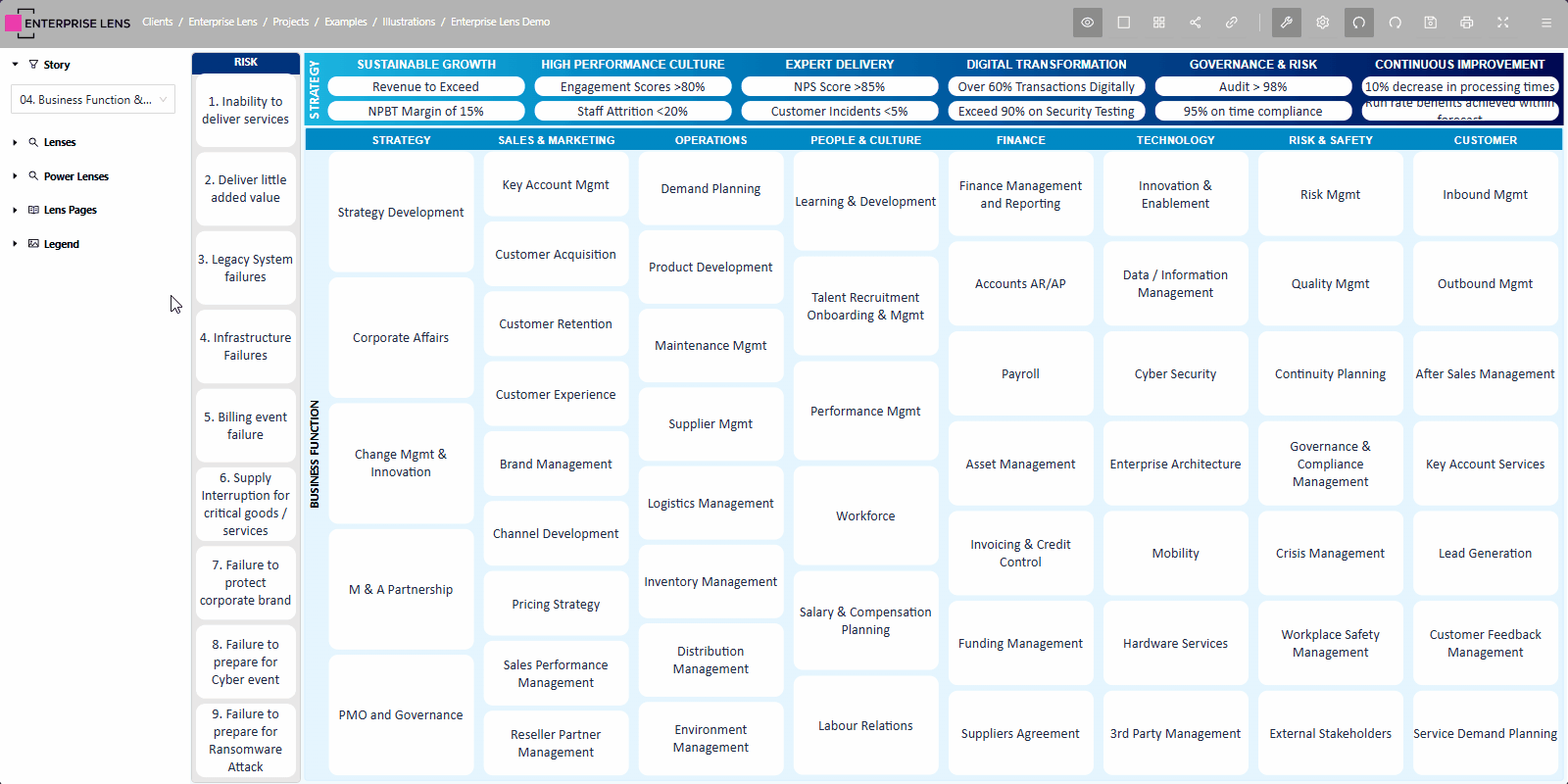- Hovering over a Business Function will show both their respective Strategy and Risk.