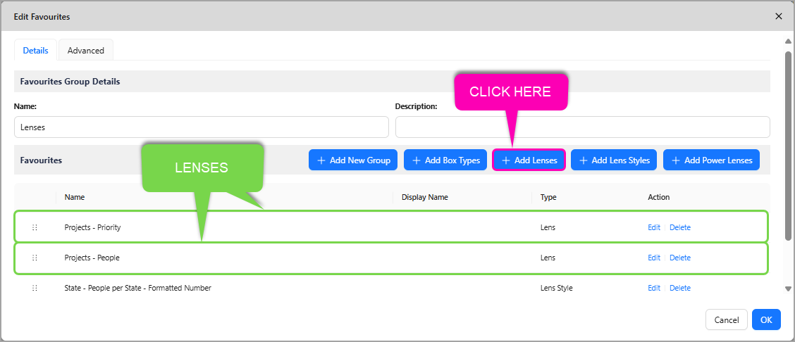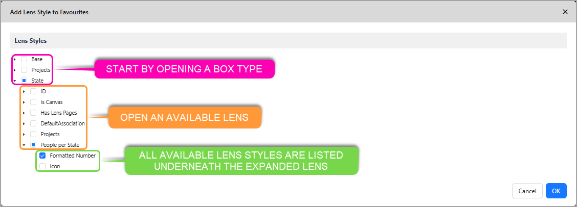 You are able to add Lens Styles to Favourites groups, this is useful for when you want to display a specific style of a Lens as opposed to turning on all styles of a Lens.