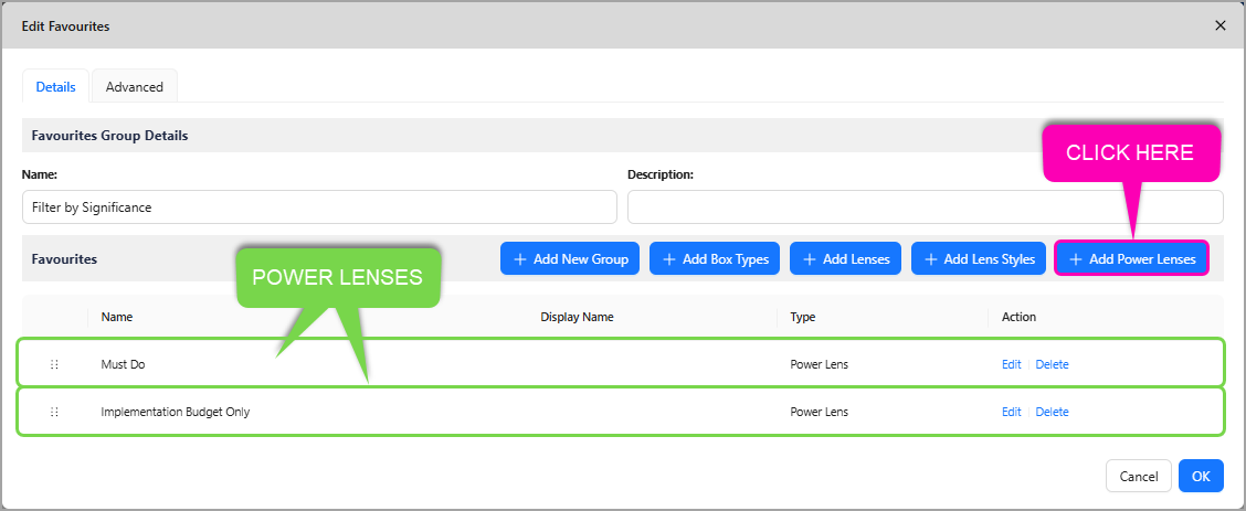 You are able to add Power Lenses to Favourites groups, with no limit on how many groups you can include them in, or how many Power Lenses you can add.