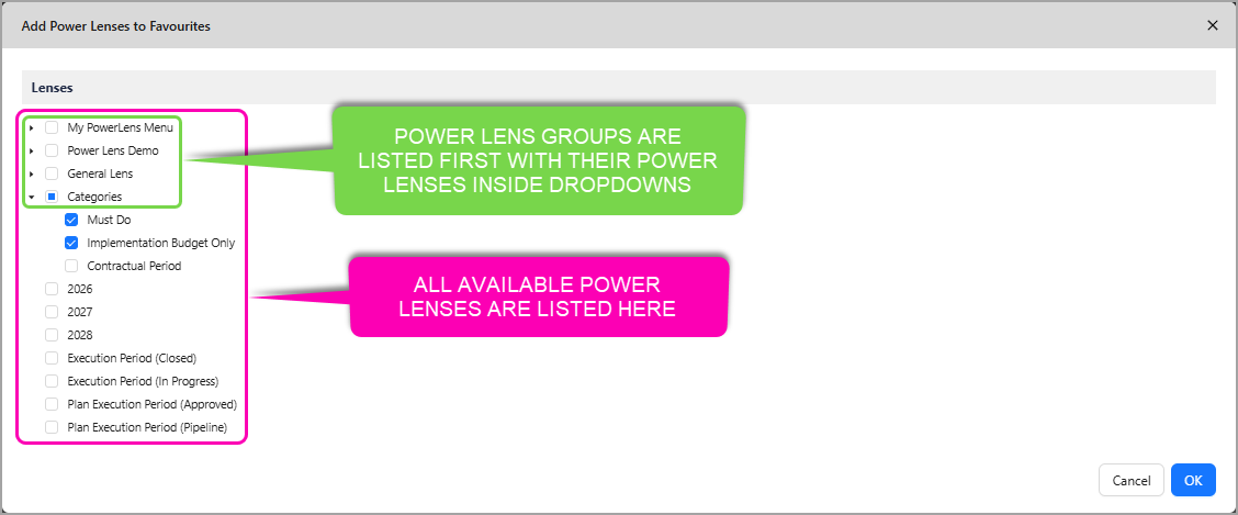 + Add Power Lensesprovides you with a list of all available Power Lenses- All Power Lens Groups will appear first in the list, with any Power Lenses available under the respective group dropdowns