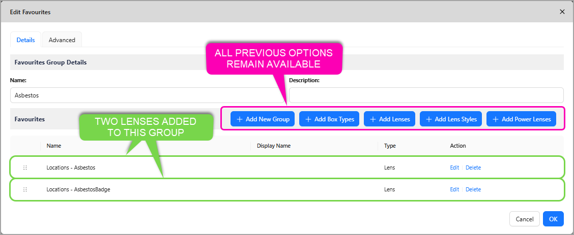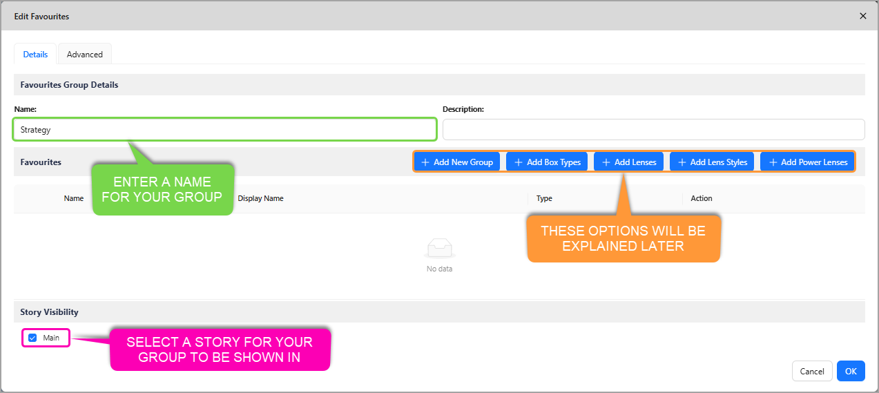 Lenses, Lens Styles, Power Lenses, and Box Types can now be grouped and stored in the Favourites Menu for quick and easy access, with the grouping configurable per story.