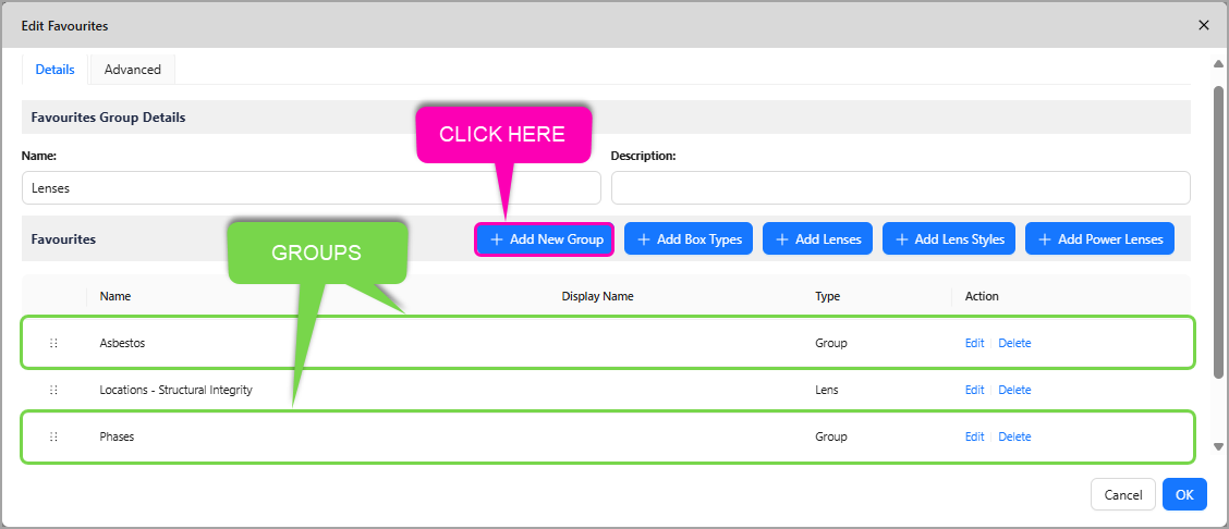 - Within a group, you can add Lenses, Lens Styles, Power Lenses, and Box Types, as well as more nested group
