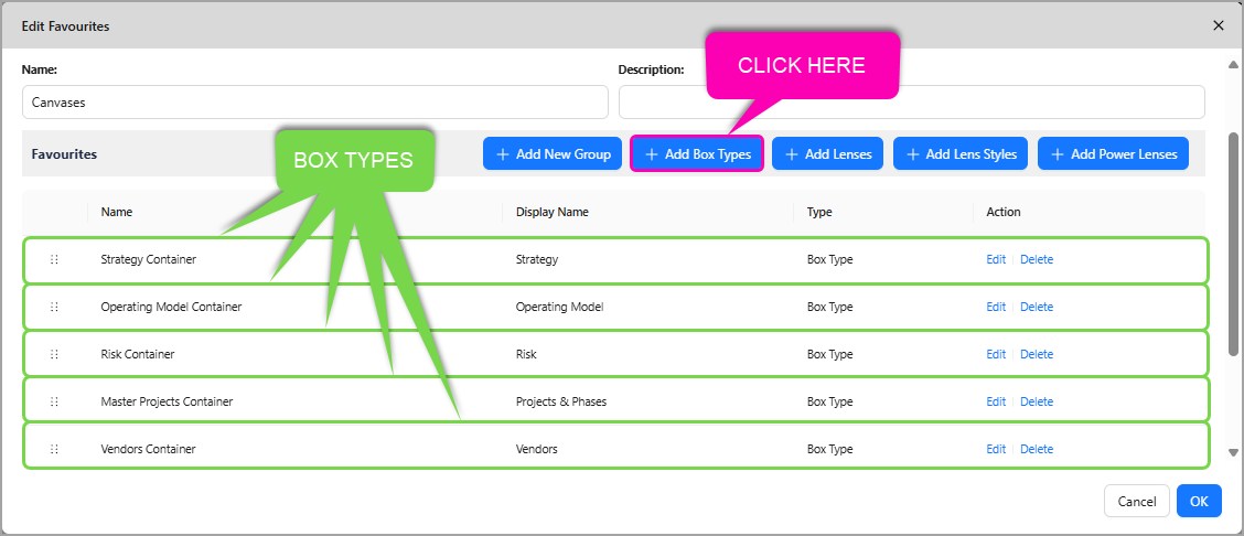 You are able to add Box Types to Favourites, this is useful for when you want to toggle on and off all boxes belonging to a certain type.