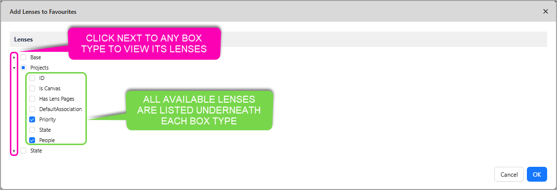 Clicking the + Add Lenses button provides you with a list of all available lenses, listed underneath each Box Type, for that illustration