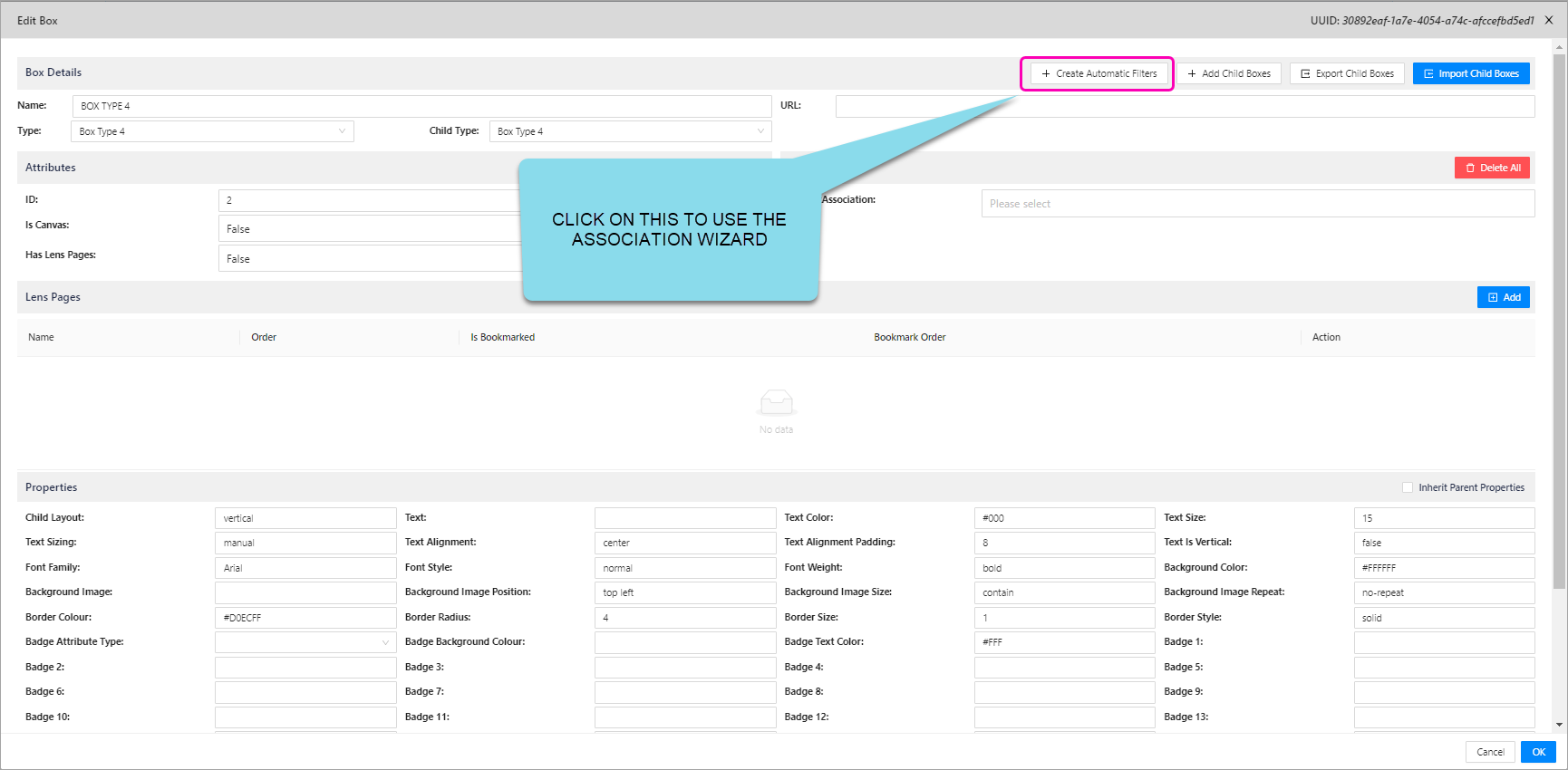 This feature easily creates associations between your boxes in a few clicks, based on the attributes within boxes. It does this by creating child boxes with the names of attributes.