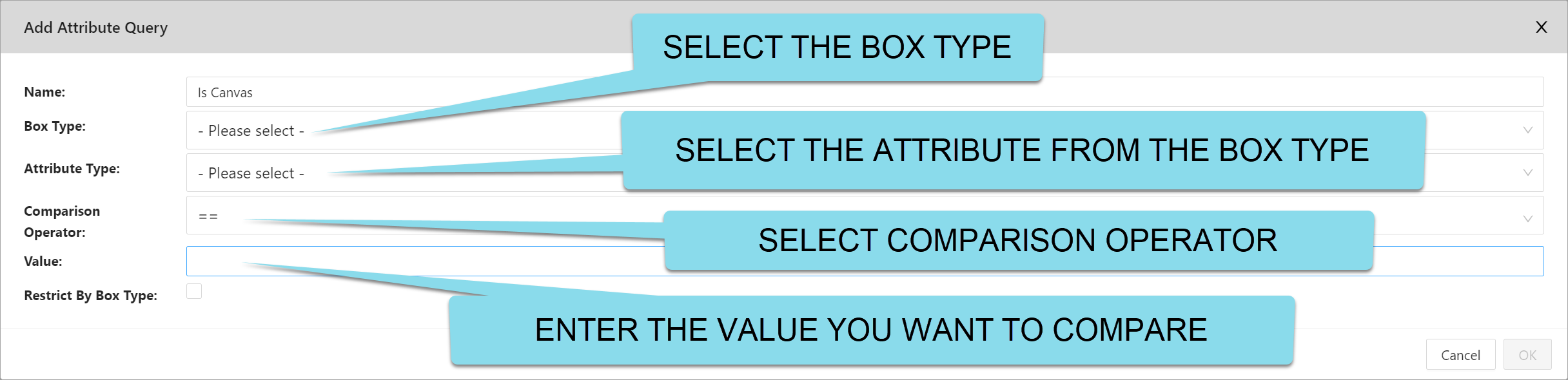 | Restrict By Box Type | Limit the attributes searched by the Query to only the box type you have specified. | This is only when you are comparing or using Box UUIDs as the Attribute Type. |