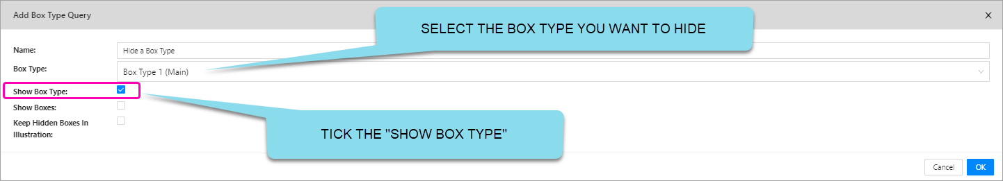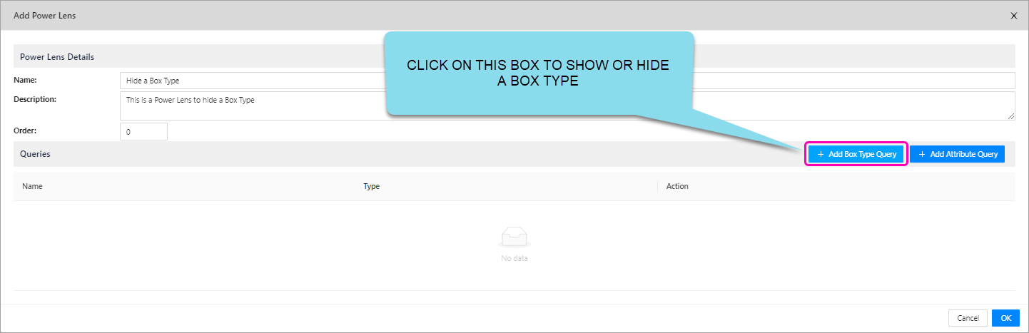 In this form, you are building a query that the Power Lens will carry out, based on a box type. This feature will enable users to show OR hide a full set of box types. Below are the options to create such a query: